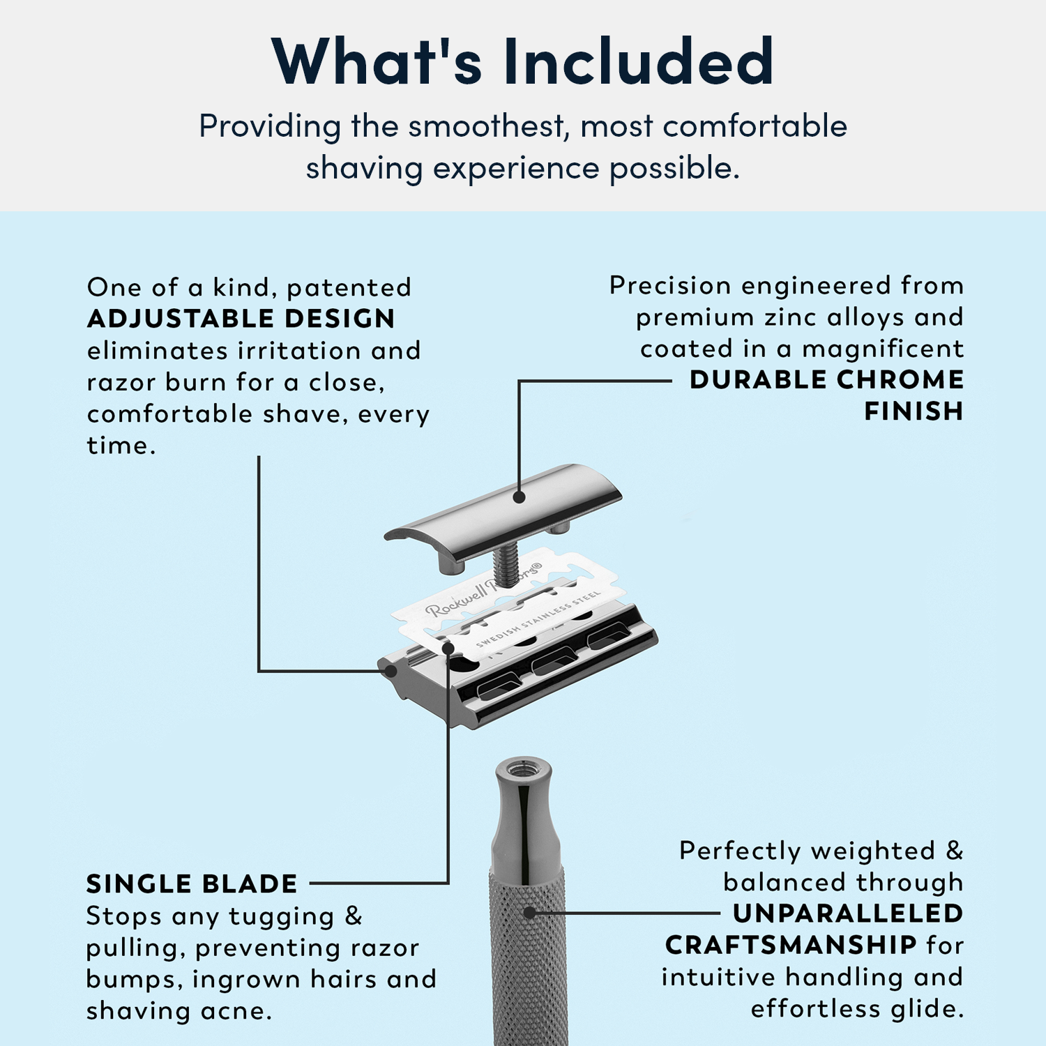 Cast from premium high-end chromed zinc alloys with a striking White Chrome or Gunmetal Chrome finish, The Rockwell 2C is perfect for budget-conscious customers and comes with the two most popular shave settings - beginner setting R1 and intermediate setting R3.